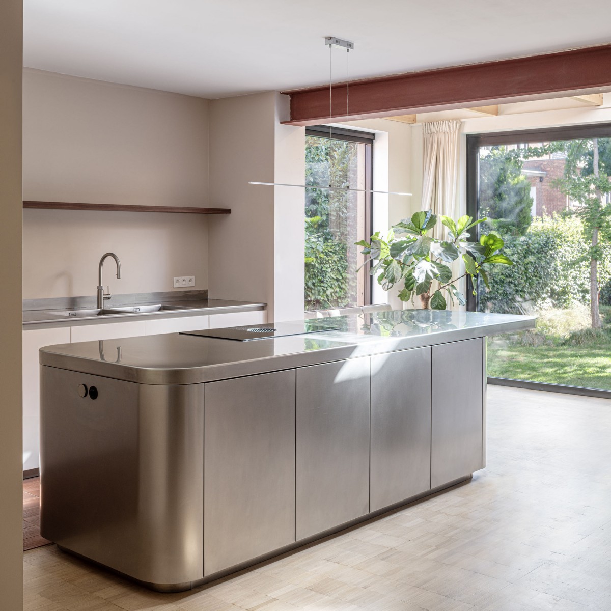 Strak ontworpen keuken met volledige inox kookeiland (Bora vuur, Quooker, Sage koffiemachine) en verfijnde details. Eiken parallelparket en warme terracotta tegel zorgen voor een tijdloze uitstraling. Grote raampartijen brengen overvloedig natuurlijk licht en zicht op de tuin. Ideaal voor lifestyle shoots, culinaire fotografie, interieurreportages of brandingcampagnes die rust, klasse en eenvoud willen uitstralen. Foto credit: Michiel Vergauwe & MORREC Keuken: BROS